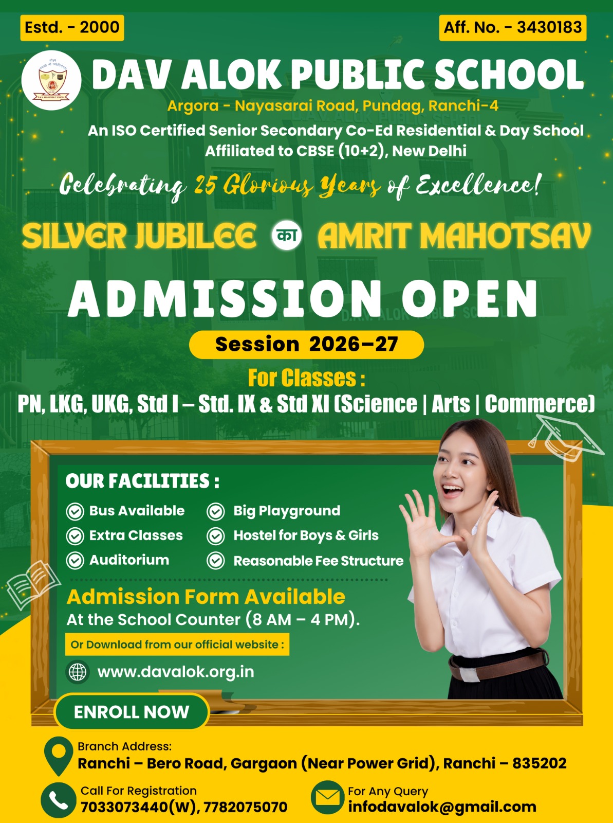 An English Medium Residential – DAV Public School for boys and girls of P.N, LKG, UKG & Std. I to XII, D.A.V. ALOK PUBLIC SCHOOL was set up in 2000 by D. SAHA D.A.V. CHARITABLE TRUST OF INDIA. Affiliated to the Central Board of Secondary Education(CBSE), New Delhi, the School offers the All India Secondary and Senior Secondary School Examinations of standard 10th and standard 12th respectively. To set up the school there is a great contribution of Mr. Sanjay Kumar Sinha (Ex. P.G.T., Physics, D.A.V. Public School, Hehal, Ranchi & Ex- Faculty of Physics of Sri Chaitanya Academy, Ranchi), Dr. Ashok Kumar (Ex. P.G.T. Chemistry, Guru Nanak Hr. Secondary School, R a n c h i& E x – Principal cum Faculty of Chemistry of Sri Chaitanya Academy, Ranchi) and Dr. Alok Kumar (Ex- P.G.T. Maths, Guru Nanak Hr. Secondary School, Ranchi & Ex- Principal (I/C) of D.A.V. Public School. Dhurwa, Ranchi ) Students of D.A.V. ALOK PUBLIC SCHOOL, feel proud to learn modern techniques, especially in Physics, Chemistry & Mathematics under the experienced guidance of above mentioned experts.